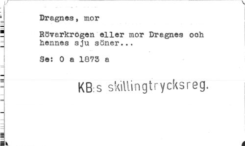 //// Dragnes, mor //// ' Rövarkrögen eller mor Dragnes ooh //// = hennes sju söner... //// Se: 0 a 1873 a //// " KB:S skilii n g t r y eks reg. //// ¦k i ////