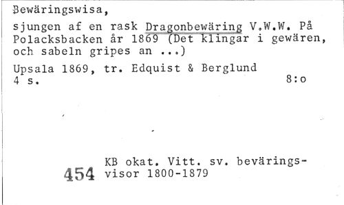 //// isewarmgswisa, //// sjungen af en rask Dragonbewäring V.W.W. På Polacksbacken år 1869 (Det klingar i gewären, och sabeln gripes an ...) //// Upsala 1869, tr. Edquist & Berglund 4 s. 8: o //// n KB okat. Vitt. sv. bevärings- //// 41" visor 1800-1879 ////