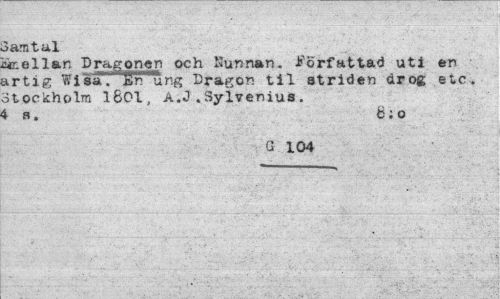 //// Samtal //// Mellan Dragonen och Kunnan. Författad uti en artig Wisa. Bn ung Dragon til striden drog etc. Stockholm 1801, A.J .Sylvenius . i s. 8;o //// G 104 ////
