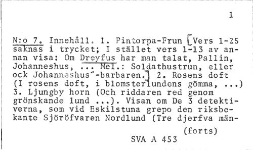 //// 1 //// N:o 7* Innehåll» 1. Pintorpa-Frun |_Vers 1-25 saknas i trycket; I stället vers 1-13 av annan visa: Om Dreyfus har man talat, Pallin, Johanneshus, ... Mel.: Soldathustrun, eller ock Johanneshus"-barbaren.l 2. Rosens doft (I rosens doft, i blomsterlundens gömma, ...) 3. Ljungby horn (Och riddaren red genom grönskande lund ...). Visan om De 3 detektiverna, som vid Eskilstuna grepo den riksbekante Sjöröfvaren Nordlund (Tre djerfva män- //// (forts) //// SVA A 45 3 ////
