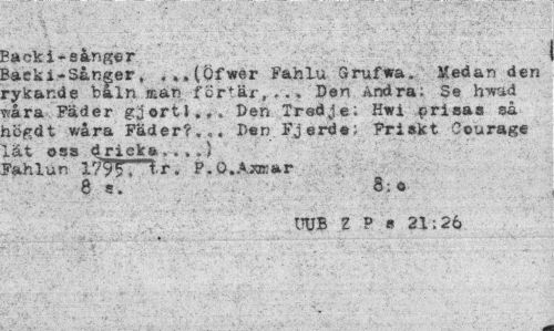 //// Back i-sånger //// Baeki-Sånger, ?»»(Öfwer Fahlu Srufwa. Medan den rykande b aln man fortär,..» Den Andra: Se hwad såra Fader gjortl... Den Tredje; fiwi prisas så tiöfrdt wåra Fader?,,, Den Fjerde; Friskt Courage lat oss dricka,,, .i Pahlun 179?» tr. P.Q.Ajasar //// 8 s. 8:o //// UUB 1 P s 21:26 ////