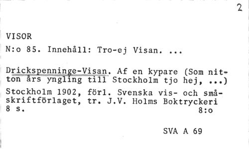 //// VISOR //// N:o 85. Innehåll: Tro-ej Visan. ... //// Drickspenninge-Visan. Af en kypare (Som nitton års yngling till Stockholm tjo hej, ...) //// Stockholm 1902, förl. Svenska vis- och små-skriftförlaget, tr. J.V. Holms Boktryckeri 8 s. 8:o //// SVA A 69 ////