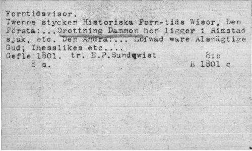 //// Forntidsviaor. //// Twenne stycken Historiska Forn-tids "Wisor, Sen Fcrsta:.. ..Drottning Daroraon hon li^er i nimstad //// Sjuk, etc. W,re AlsTiägti<?e Gud; The3Slikes etc ... . //// Gefle lBoi. tr. E.P.Sund*wist Ö:o //// 3 s- . ii XÖOl c ////