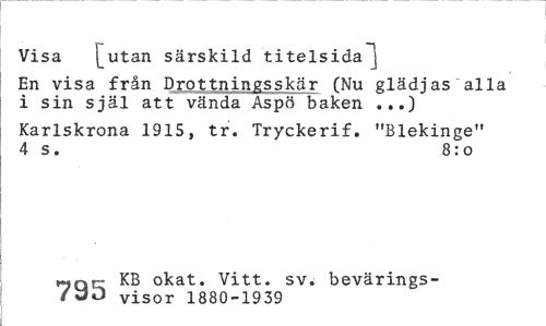 //// Visa ^utan särskild titelsida"] //// En visa från Drottningsskär (Nu glädjas alla i sin själ att vända Aspö baken ...) //// Karlskrona 1915, tr. Tryckerif. "Blekinge" 4 s. 8:0 //// «Qr KB okat. Vitt. sv. bevärings- //// visor 1880-1939 ////