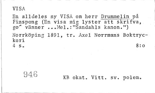 //// VISA //// En alldeles ny VISA om herr Drummelin på Finspong (En visa mig lyster att skrifva, go" vänner .. .Mel.: "Sandahls kanon.'1) //// Norrköping 1891, tr. Axel Norrmans Boktryckeri //// 4 s. 8:0 //// q 4 B //// KB okat. Vitt. sv. polem. ////
