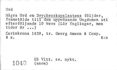//// Ord //// Några Ord om Dryckenskapslastens följder, framstälda till den uppv/äxande Ungdomen uti efterföljande 10 Wers (Lär Ynglingar, men tider är ...) //// Carlskrona 1839, tr. Georg Ameen & Comp. 8 s. ~ 8:o //// KB Vitt. sv. nykt. 1040 (anon) ////