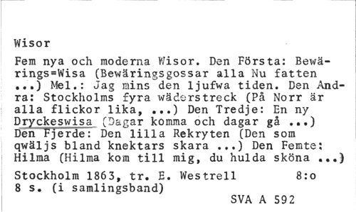 //// Wisor //// Fem nya och moderna Wisor. Den Första: Bewä-rings=Wisa (Bewäringsgossar alla Nu fatten ...) Mel.: Jag mins den ljufwa tiden. Den Andra: Stockholms fyra wäderstreck (På Norr är alla flickor lika, ...) Den Tredje: En ny Dryckeswisa (Dagar komma och dagar gå ...) Den Fjerde: Den lilla Rekryten (Den som qwäljs bland knektars skara ...) Den Femte: Hilma (Hilma kom till mig, du hulda sköna ...) //// Stockholm 1863, tr. E. Westrell 8:0 //// 8 s. (i samlingsband) //// SVA A 59 2 ////