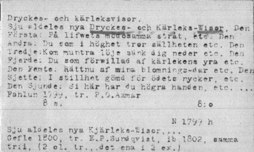 //// Dryekes- och kärleksvisor, //// Sju »Iceles nya Dryekes- ccp. Kärlek a-W^&jgr. -Der. Pcrata-: Få li fweToffWfäTOR stråt, etc!' "Den Åndri.. : Du com i höghet tror eallheten etc. Pen T red^ e tKom muntra löje sank dig ned er etc. Den Pjerde; Du som förvillad af kärlekens yra etc. Den i'era te. Rät t nu af mina b lösnings-dar etc, De! Sjette; I stillhet gömd för ödete rycker, etc, Den Sjunde; c?i här har du högra handen, etc. . „ Pahlun 1 v , tr. É.O.Axm&r //// . 8 a. 8;o //// K 17V9 h //// Sju alo eles nya Kj ärl.eke-fciaor , ». . Gefle 1800, tr. E.P.Sund qvi st, ib.l802, samma //// ¦»» ¦ 5 ( ? n1 1 r ii i» nna i U v > ////
