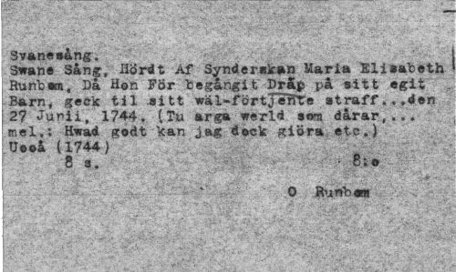 //// Svanesång-. //// Swane Sång, Hördt Af Synderskim Maria Elisabeth Runbsm, Då Hon För begångit Dr£|s pä sitt egit Barn, geck til sitt wäl-förtJeRte straff...den 27 Jurii, 1744. (Tu arga werld som dårar,... mel.: Hwad godt kan jag dock giöra etc.) Ueoå (1744) //// 8a. • 8;o //// 0 frxribm ////