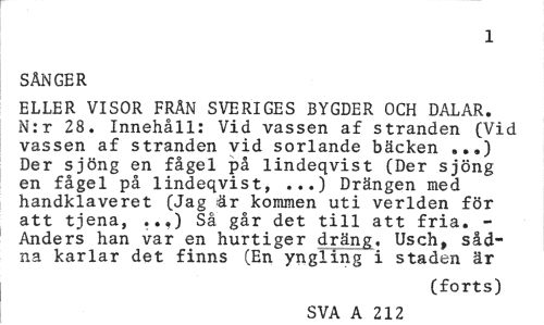 //// 1 //// SÅNGER //// ELLER VISOR FRÄN SVERIGES BYGDER OCH DALAR. N:r 28. Innehåll: Vid vassen af stranden (Vid vassen af stranden vid sorlande bäcken ...) Der sjöng en fågel på lindeqvist (Der sjöng en fågel på lindeqvist, ...) Drängen med handklaveret (Jag är kommen uti verlden för att tjena, Så går det till att fria. - //// Anders han var en hurtiger dräng, Uscht såd-na karlar det finns (En yngling i staden är //// (forts) //// SVA A 212 ////