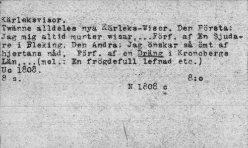 //// kärleksvisor. //// Twänne alldeles nya Kärleks-Visor. Den Första: Jag mig altid murter. wisar, ., .Förf. af En Sjuda-re i Bleking. Den Andra; Jag önskar så ömt af hjertans nåd. Förf. af en Drär.g. i Kronobergs Län,...(mel.: In frögdefull lefnad etc.) Uo l808. //// 8s. * 8; o //// K 1808 c //// -" .. / . " , > -r: pt,. „ - V - - ¦ ////