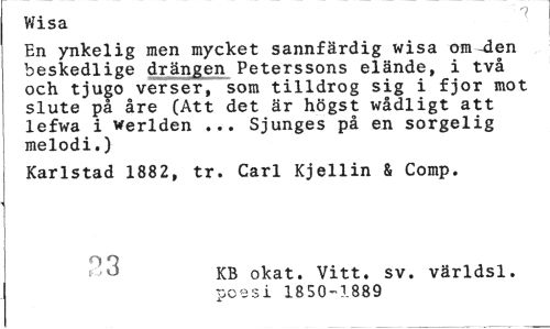 //// Wisa //// En ynkelig men mycket sannfärdig wisa om-den beskedlige drängen Peterssons elände, i två och tjugo verser, som tilldrog sig i fjor mot slute på åre (Att det är högst wådligt att lefwa i werlden ... Sjunges på en sorgelig melodi.) //// Karlstad 1882, tr. Carl Kjellin & Comp. //// oq //// KB okat. Vitt. sv. världsl. //// poesi 1850-1889 ////
