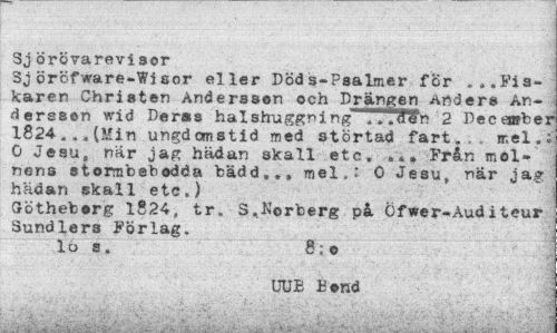 //// Sj örövarevi sor //// Sjöröfware-Wisor eller Döds-Psalmer for ...Fiskaren Christen Andersson och Drängen Anders Andersson wid Deras halshuggning ...den 2 Dectarber 1824...(Min ungdomstid med störtad fart... mel.; O Jesu, när jag hädan skall etc. ... Från molnens stormbebodda bädd... mel.: 0 Jesu, när jag hädan skall etc.) //// Götheborg 1S24, tr. 3,Korberg pa Cfwer-Auditeur Sund lers Förlag. //// los. 8: o //// UUE Kond ////