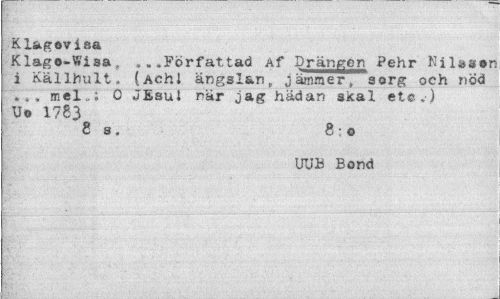 //// K lagovisa //// Klago-Wisa, ...Författad Af Drängen Pehr Kilasor i Källbult, (AchJ ängslan,, jämmer, sorg och nöd ... mel..; 0 JEsul när jag hädan skal etc.-) Uo 1783 //// S s. 8 • o //// UUB Bond ////