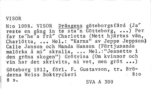 //// VISOR //// N:o 1008. VISOR Drängens göteborgsfärd (Ja** reste en gång in te sta"n Götteborg, ...) Per far te'he'a frå' Charlotta (Mett hjärtas vän, Charlötta, ... Mel.: "Karna" av Jeppe Jeppson) Calle Janson och Manda Hanson (Förtjusande malörka å mi-* skralla, ... Mel.:"Jeanette i den gröna skogen") Grötvisa (Om kvinnor och vin har det skrivits, ni vet, men gröt ...) //// Göteborg 1912, förl. F. Gustavson, tr. Bröderna Weiss Boktryckeri 8:0 //// 8 s> SVA A 300 ////