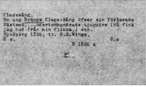 //// Klages&ng. //// Bn ung Dragga Klage-3ång öfwer sin förlorade Fä s t em öT^.^er tonhund rade tjugutre ('di fick jag hud frår. min flicka,) etc. Nyköping 1826, tr. P.E.Winge, 8a. o;o //// N 1826 a //// ... //// ' i - .,'••. ... ii T'Mt^aB^aMMBMit J^tealiBfflB ////