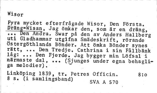 //// Wisor //// Fyra mycket efterfrågade Wisor, Den Första. Dräng»Wisan, Jag ömkar den, som är en dräng, ... Den Andra. Swar på den av Anders Hallberg uti Gladhammar utgifna Smädeskrift, rörande östergöthlands Bönder. Att ömka Bönder synes rätt, ... Den Tredje. Cathrina i sin Fållbänk låg: ... Den Fjerde. Jag bygger min Löfsal i närmaste dal, ... (Sjunges under egna behagliga melodier). //// Linköping 1839, tr. Petres Officin. 8:0 //// 8 s. (i samlingsband) $VA A 57Q //// I ' ////