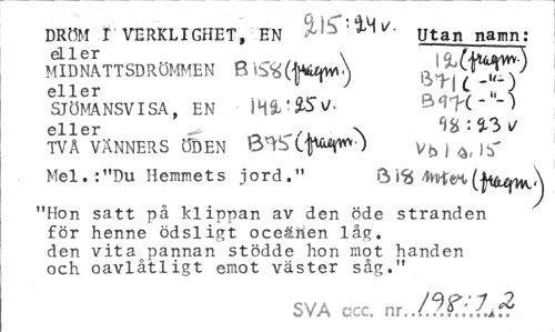 //// DRÖM r VERKLIGHET, EN utan namn: //// MIDNATTSDRÖMMEN 8 (^KUpv^ //// SJÖMANSVISA, EN iQ^C'"-) eller x WM * //// TVÅ VÄNNERS ÖDEN B^Slf^) VbUJi' //// Mel.-: "Du Hemmets jord." /Ivitfea //// "Hon satt på klippan av den öde stranden för henne ödsligt oceåMen låg. den vita pannan stödde hon mot handen och oavlåtligt emot väster såg." //// SVA ccc. ////