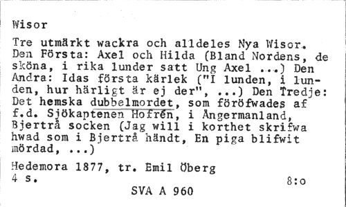 //// Wisor //// Tre utmärkt wackra och alldeles Nya Wisor. Den Första: Axel och Hilda (Bland Nordens, de sköna, i rika lunder satt Ung Axel ...) Den Andra: Idas första kärlek ("I lunden, i lunden, hur härligt är ej der", ...) Den Tredje: Det hemska dubbelmordet, som föröfwades af f.d. Sjökaptenen Hofrén, i Ångermanland, Bjertrå socken (Jag will i korthet skrifwa hwad som i Bjertrå händt, En piga blifwit mördad, ...) //// Hedemora 1877, tr. Emil Öberg 4 s. 8:0 //// SVA A 960 ////