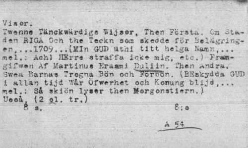 //// V i s or. //// Twenne Tänclcwärdige 'Then Första, Om .Sta- //// den RIGA Och the Teekn som skedde för Belägring-er 1709 .. .(Min GUD tlthi titt helga Namn. mel.; Ashl HErre straffa icke mig, etc.) Fr»»* gifvren Af Martinus ErasraJ JDuliin. then nndra. Swea Barnas Trogna Bön o c Vi" Formen . (.BE skydda GUD i allan tijd Tår Öfwerhet och Konung blijd ,... mel,; Så skicn lyser then Äorgonstiern.} Uooa. (2 §1. tr.) //// ca,' 8:o ////