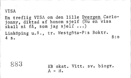 //// VISA //// En treflig VISA om den lille Dvergen Carlo-jonny, diktad af honom sjelf (Nu en visa skall ni få, som jag sjelf ...) //// Linköping u.å,, tr. Westgöta-P:s Boktr. 4 s. 8:0 //// KB okat. Vitt. sv. biogr. A - H. ////