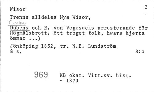 //// Wisor //// Trenne alldeles Nya Wisor, //// jTajjVV //// Dtibens och E, von Vegesacks arresterande för fR5gmålsbrott. Ett troget folk, hwars hjerta ömmar ...) //// Jönköping 1832, tr. N.E. Lundström 8 s. 8:0 //// 969 KB okat. Vitt.sv. hist. //// - 1870 ////