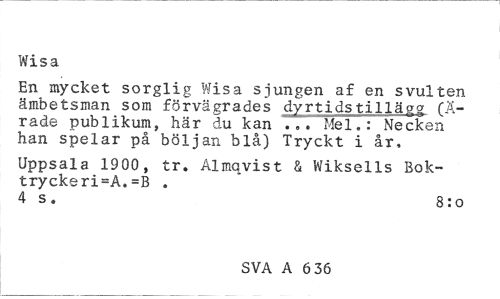 //// Wisa //// En mycket sorglig Wisa sjungen af en svulten ämbetsman som förvägrades dyrtids tillägg (Ä-rade publikum, här du kan ... Mel.: Necken han spelar på böljan blå) Tryckt i år, //// Uppsala 1900, tr. Almqvist & Wiksells Boktryckeris. =B . //// 4 s. 8:0 //// SVA A 6 36 ////