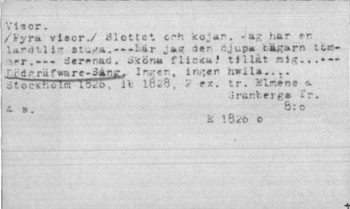 //// Visor. //// /Fyra visor./ Slottet crh k oj ar. Jag har er lardtl i.7 stu^a. --liär jas; der- njup» bägarn tca-Serenad. ^'<öna flickaJ tillåt mig. . .- ¦f;cd.grufvvarc-Sar^. Ingenf in-*er hw j.la... St o c < h o im i 51-oi i- l8c8s ? ex. tr. Flirtens //// iranbergs 'fr. is. 6: o //// B; 1826 o ////