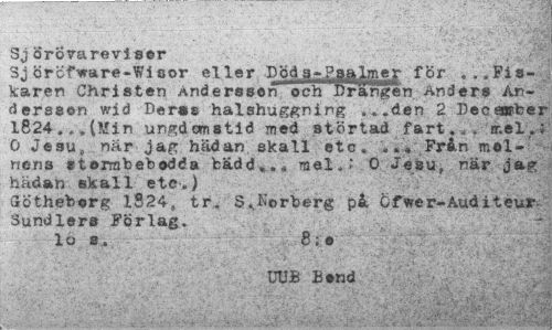 //// -'¦•'i V- - • Vr^V^ÉII //// Sjörörarevisor //// 3j örofware-Wisor eller Död 3-Psalmef för ,,.Fis~ karen Christen Andersson och Drängen Anders Andersson wid Deras halshuggning ...den 2 December 1824.,.(Min ungdomstid med störtad fart... mel.; 0 Jesu, när jag hädan, skall etc» . „« Fr4n molnens »torrabebodda bädd,,» mal.; 0 Jesu» när jag hädan skall etc.) //// GÖtheborg 1824, tr. 3.Korberg på. Cfwer-Auditeur. Sundlers Förlag. //// lo s. 8; • //// UUB Band //// ',.,.•¦.".. •¦¦¦.¦ r '•¦•• •'v -'v.; i. //// : ¦¦ ¦¦ v, • .: ¦ ;,. v- ////