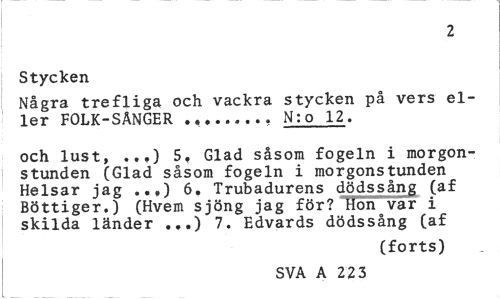 //// 2 //// Stycken //// Några trefliga och vackra stycken på vers eller FOLK-SÄNGER ... N:o 12. //// och lust, .,.) 5. Glad såsom fogeln i morgonstunden (Glad såsom fogeln i morgonstunden Helsar jag ..,) 6. Trubadurens dödssång (af Böttiger.) (Hvem sjöng jag för? Hon var i skilda länder ...) 7. Edvards dödssång (af //// (forts) //// SVA A 223 ////