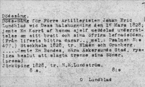 //// Död asång. //// för Förre Artilleristen Johan Eric Lundblad wid Dess halshuggning den l^ Mars 1828j jemte En Korrt af honors sjelf meddelad underrättelse om sitt brott och sina öfriga lefnadsöden. (Från lifwets bittra dasrar. . , ^mel.; Psalmen N; • 477.) Stockholm 1828, tr. Elmén och Granberg. ... , Jemte En Bondes, nära Äskersunds Stad, rysliga beslut att slagta trenne sina Söner. { prosa) //// Jönköping 1828, tr. H.E.Lund ström. //// " 8 a. ¦ 8: • //// 0 Lundblad ////