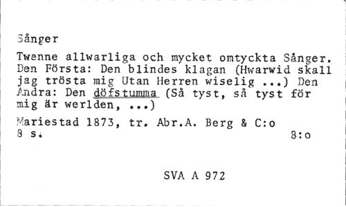 //// Sånger //// Twenne allwarliga och mycket omtyckta Sånger. Den Första: Den blindes klagan (Hwarwid skall jag trösta mig Utan Herren wiselig ...) Den Andra: Den flöfstumma (Så tyst, så tyst för mig är werlden, ...) //// Mariestad 1873, tr. Abr.A. Berg & C:o 8 Si 8:0 //// SVA A 972 ////
