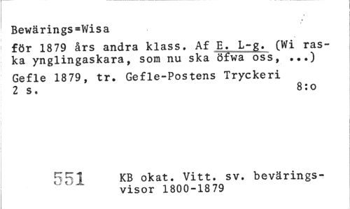 //// Bewärings=lVisa //// för 1879 års andra klass. Af E. L-g. (Wi raska ynglingaskara, som nu ska öfwa oss, ...) //// Gefle 1879, tr. Gefle-Postens Tryckeri 2 s. 8:o //// 551 KB okat. Vitt. sv. bevärings-visor 1800-1879 ////