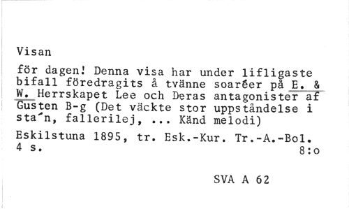 //// Visan //// för dagen] Denna visa har under lifligaste bifall föredragits å tvänne soaréer på E. & W. Herrskapet Lee och Deras antagonister af Gusten B-g (Det väckte stor uppståndelse i sta'n, fallerilej, ... Känd melodi) //// Eskilstuna 1895, tr. Esk.-Kur. Tr.-A.-Bol. 4 s. 8:0 //// SVA A 62 ////
