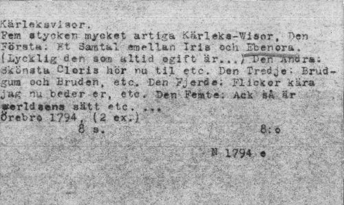 //// tärlekaviaor. //// Per? stycken mycket artiga Kärleka-Wiaor, Den Första; Et Samtal emellan Iris och Sbenora. (Lycklig den »o® altid ogift är... ri>«.n "kmra. dkönata Cleris hör ru til etc. Den Xred4e^ Brudgum och Bruden, etc. Den Fjerde. Flickor kara Jag tu beder er, etc. "Den Femte; Ack så är «erlds«ns sätt etc. »,« Örebro 1794. (2 ex.) //// é s. //// , ' . ' . I V 1794- t //// . ¦ " • ¦ ./" ' . .V.¦¦ ¦ //// ¦¦• ¦¦!..:. t v-- . ... • .••-•• lv >. ^ : .(i^. ¦¦¦-¦¦--. ¦ .* ...-¦>-.,. - //// • . l >'> - / * //// i- • . - ..'-.V".-,..."v-;.?-/. :' ' ////