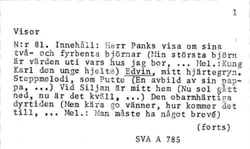 //// 785 //// Visor //// i //// N:r 81. Innehåll: Herr Panks visa om sina två- och fyrbenta björnar (Min största björn är värden uti vars hus jag bor, ... Mel.:Kung Karl den unge hjelte) Edvin, mitt hjärtegryn. Steppmelodi, som Putte (En avbild av sin nappa, .?,) Vid Siljan är mitt hem (Nu sol gått ned, nu är det kväll, ...) Den obarmhärtiga dyrtiden (Men kära go vänner, hur kommer det till, ,«. Mel.: Man måste ha något brevé) //// (forts) //// SVA A 47? ////