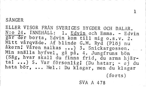 //// 1 //// SÅNGER //// ELLER VISOR FRÄN SVERIGES BYGDER OCH DALAR. N:o 24. INNEHÅLL: 1. Edvin och Emma. - Edvin går der borta, Edvin kom till mig o.s.v. 2. Mitt vårqväde. Af blinde G.M. Ryd (Plöj nu åkern! Våren nalkas ...) 3. Snickargossen. Min snälla hyfvel, gå på. 4. Jungfruns bön (Säg, hvar skall du finna frid, du arma hjärta! ...) 5. Var försonlig! (Du hatar; - ej du hata bör, ... Mel.: Du klagar, men du klagar //// (forts) //// SVA A 4 78 ////