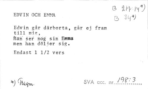 //// b %irnV //// EDVIN OCH EMMA y //// Edvin går därborta, går ej fram till mig, //// Han ser nog sin Effroa men han döljer sig. //// Endast 1 1/2 vers //// *) SVA ccc. nr../.?.?'.?... ////