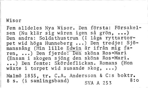 //// Wisor //// Fem alldeles Nya Wisor. Den första: Försakelsen (Nu klär sig wåren igen så grön, .,.) Den andra: Soldathustrun (I låga ryttartor-pet wid höga Hunneberg ..,) Den tredje: Sjömanssång (Min lille Edwin är ifrån mig faren, ...) Den fjerde:"Den sköna Ros=Mari (Ensam i skogen sjöng den sköna Ros=Mari. ...) Den femte: Skördeflickan. Romans (Hon wäxte i torpet wid susande skog, ...) //// Malmö 1855, tr. C.A. Andersson & C:s boktr. 8 s. (i samlingsband) A 253 8:0 ////