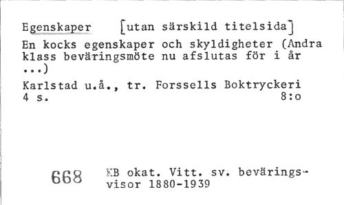 //// Egenskaper [utan särskild titelsidaJ //// En kocks egenskaper och skyldigheter (Andra klass beväringsmöte nu afslutas för i år //// Karlstad u.å., tr. Forssells Boktryckeri 4 s. 8:0 //// 000 KB okat. Vitt. sv. bevärings-DDO visor 1880-1939 ////