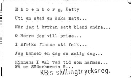 //// Ehrenborg, Betty ¦ Uti en stad en änka satt... //// När jag i kyrkan satt bland andra... //// 0 Herre jag vill prisa... //// 1 Afrika finnes ett folk... //// Jag känner en dag en salig dag... //// Minnens I väl vad tid som närmas... På em Söderhavets 5... , //// KB s skillingtrycksreg. ////