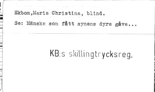 //// Ekbom,Maria Christina, blind. //// ¦ //// Se: Mänska som fått synens dyra gåva... //// KB:S skillingtrycksreg, ////