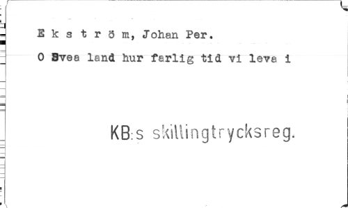 //// g Ekström, Johan Per. ¦ //// _ 0 Bvea land hur farlig tid vi leva i //// KB:S skillingtrycksreg. ////