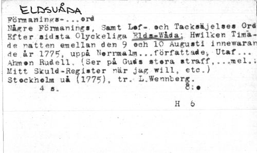 //// "Form anings- . .. ord //// Någre Förmaning», Samt L»f- »ch Tacksäjelse» 0r< Efter sid sta Olyckeliga ^]dg-Wlda-. Hwilken Tima de matten e-nellan den 9 och 10 Augusti innewarai de år 177*s uppå Nerrraalm .. .författade, Utaf... Ahman Rade 11, (Ser på Guds st»ra straff,.. .mel. Mitt Skuld-Register när jag will, etc.) Stockholm uå (1775), tr. L.Wennberg. //// 4 s . 8; • //// | H 6 ////