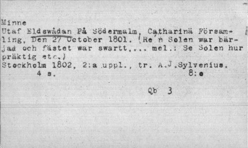 //// Minne //// Utaf Eldgwådan På Södermalaj, Catharina Församling, Ten Uctober 1801. 'Ke n Solen war bär-jad och fästet war swartt,.,. mel.; Se Solen hur präktig <tr,j //// Stockholm 1802, 2;a.uppl., tr. A, 3 .Sylvenius, 4 s, 8;o //// Q,b 3 ////