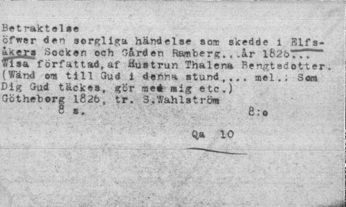 //// Betraktel se //// ofwer den sorgliga händelse som skedde i Slf3-akers Socken och Gården Ramberg,, .år 1826", .T iTisa författad, af Hustrun Thalena Bengtsdetter. (Wänd om till Gud i dehha stund,... mel.; Som Dig Gud täckes, gör me* mig etc.) Götheborg 1826, tr. 3,Wahlström //// 8 s. 8:o //// Q,a 10 ////