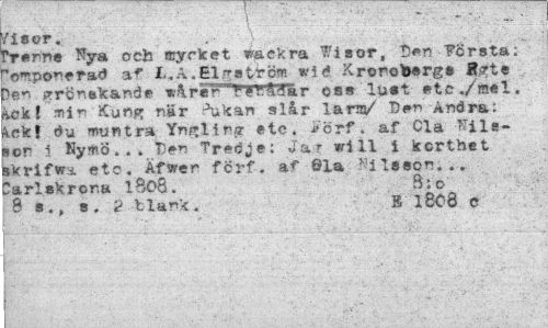 //// \ - ' //// Visor. //// Tre me och mycket wackra Wisor, 3*n Första: Pomporerad L.A,El^atrc-* wi é Kronobergs Hg-te pen frrcnekande *^rer"'"PIRAåar oss lust etc./mel. 'kokl min Kung när Jukan slår larm/ "Den Andra: kck! du muntra Yngling etc. >'örf. af "Cla -^ils- //// Eor i Nymö... T)en Tredje: Ja r will i korthet krifwi etc. Afwer förf. af 61a Nilsson... Karlskrona l8oS. B: o //// 8 s ., s. 2 blank. B l808 c //// ... ... . ; -- ¦ .i: " - ////