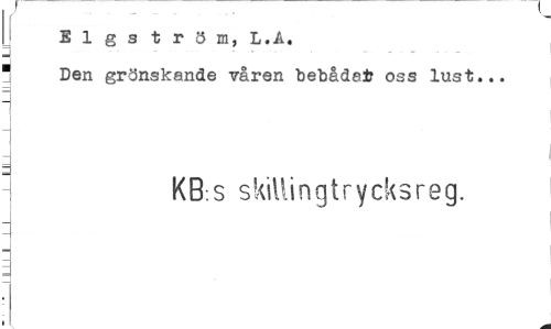 //// Elgström, L.A. 1 Den grönskande våren bebådafc oss lust... //// KB.s skillingtrycksreg. ////