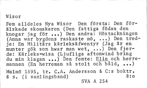 //// Wisor //// Fem alldeles Nya Wisor Den första: Den förälskade skomakaren (Den fattiga födan den knogar jag för ...) Den andra: Hös täckningen (Anna war bygdens raskaste mö, ...) Den tredje: En Militärs kärleksäfwentyr (Jag är en munter gök som hwar man wet, ...) Den fjer-de: Kärleks=wisa (Ljufliga aftonwind bring du min klagan ...) Den femte: Elin och herremannen (En herreman så stolt och båld, ...) //// Malmö 1895, tr. C,A. Andersson å C:s boktr. 8 s. (i samlingsband) 8:0 //// SVA A 254 ////