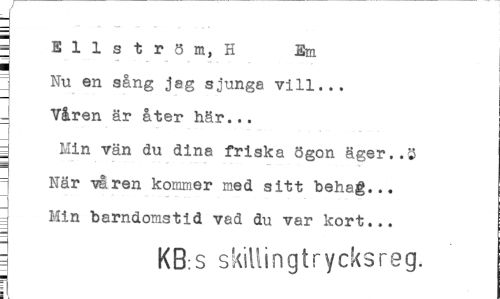 //// t //// i //// \ Bilström, H Em //// j Nu en sång jag sjunga vill... _ Våren är åter här... _ Min vän du dina friska ögon äger..i> När våren kommer med sitt behag... Min barndomstid vad du var kort... //// i KB s skillingtrycksreg. //// ¦ ////